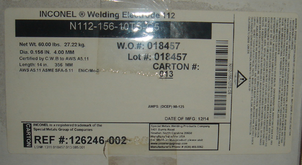 AWS A5.11,ENiCrMo-3 DIN 1736 EL-NiCr20Mo9Nb ASME Ⅱ,SFA 5.11,ENiCrMo-3 Werkstoff Nr.2.4621 規(guī)格 ASME Ⅸ,F-No.43 ISO ENi6625 MIL-E-22200/3 Type MIL-IN12 Europe ENiCr22Mo9Nb UNS W86112 | |